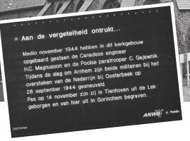 Herdenking van de op 14 november 1944 uit de Lek geborgen Canadese engineer H.C. Magnussen en de Poolse paratrooper C. Gajewnik In het Nieuwsblad 2004-3 is een artikel gepubliceerd over de Canadese… Lees meer