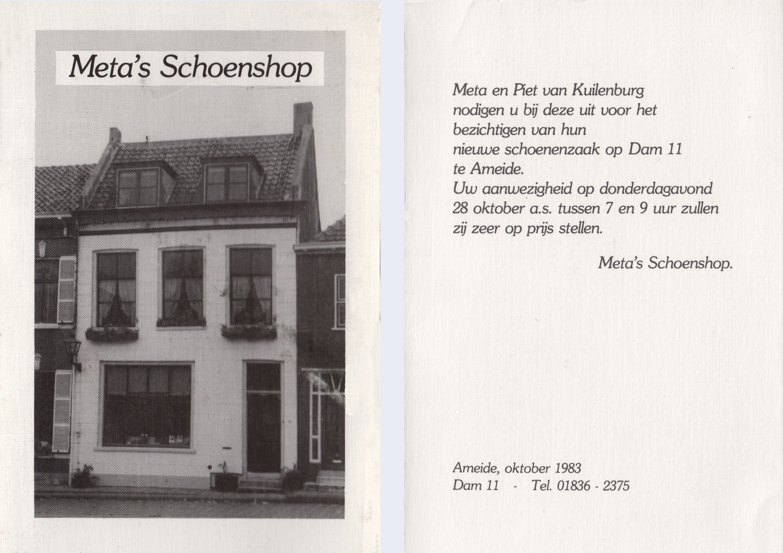 Op Dam 11 in Ameide is op 28-10-1983 de winkel “Meta’s Schoenshop” geopend. De eigenaren van deze winkel zijn Meta van Kuilenburg-Oosterom en Piet van Kuilenburg. De foto’s en kaarten ontvingen we [...]