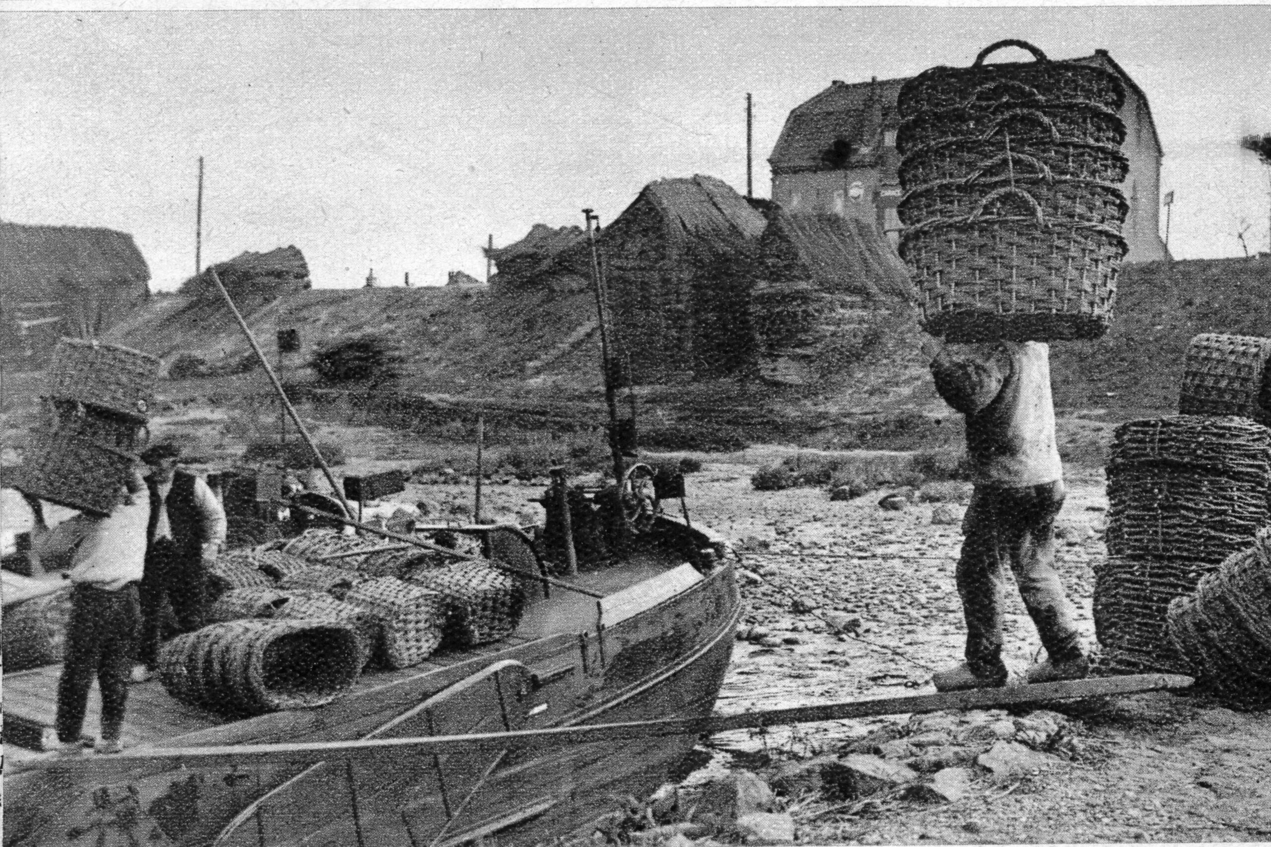 Het laden van bloemenmanden. Op het schip staat schipper Henk Diepenhorst (bijgenaamd ‘de stomp’) uit de Liessteeg.