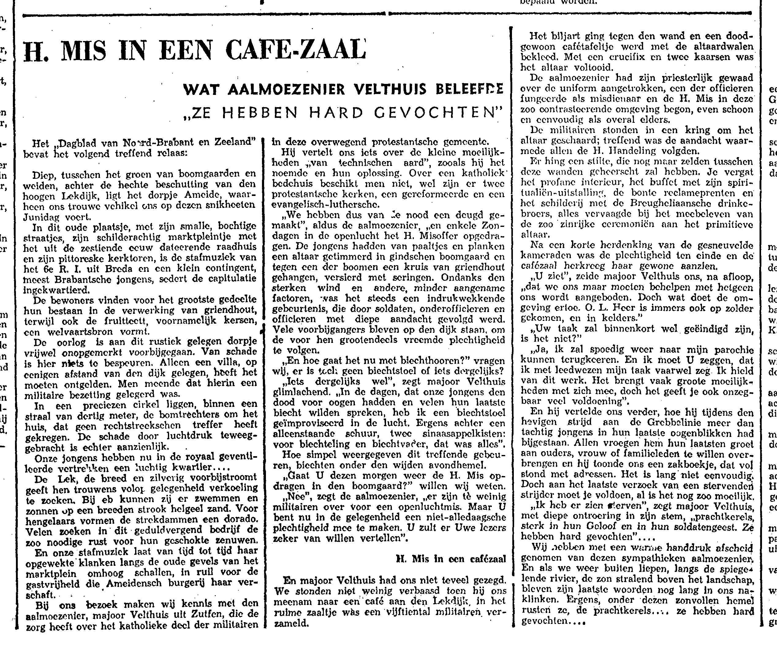 “Iets dergelijks wel”, zegt majoor Velthuis glimlachend. “In de dagen, dat onze jongens den dood voor oogen hadden en velen hun laatste biecht wilden spreken, heb ik een biechtstoel geïmproviseerd in de lucht. Ergens achter een alleenstaande schuur, twee sinaasappelkisten: voor biechteling en biechtvader, dat was alles”.