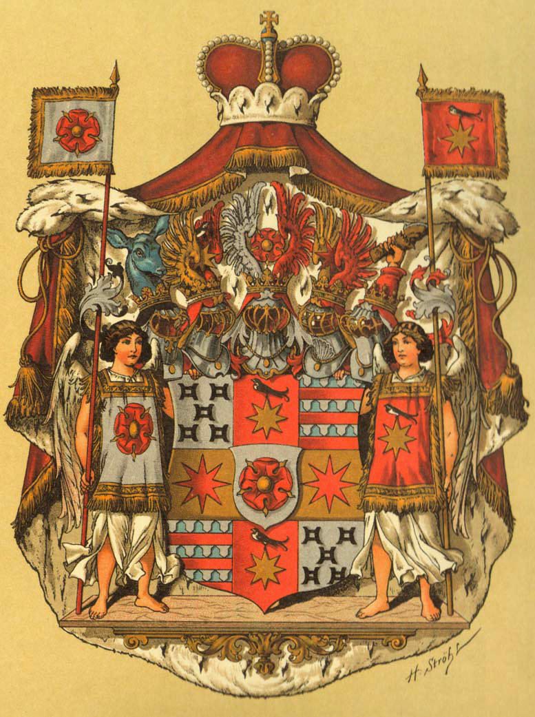 Der Herzschild enthält die goldene Rose im silbernen Felbe, wegen Lippe; das mittelste, obere und untere Feld eine Schwalbe, die auf einem goldenen Stern steht, in Roth, wegen Schwalenberg; die beiden mittleren Seitenfelder zeigen einen rothen Stern in Gold, wegen Sternberg.