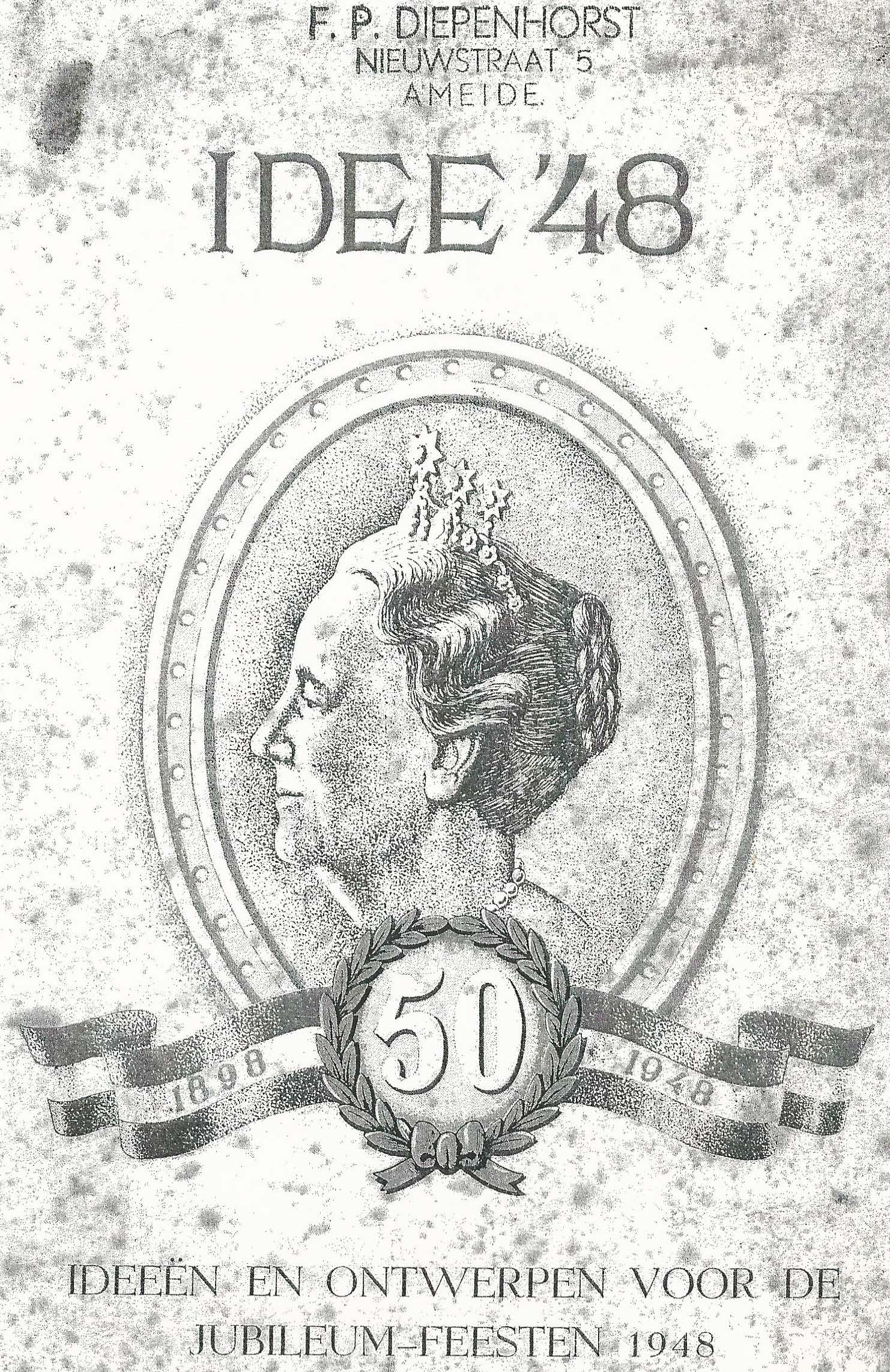 Aan Allen die ter gelegenheid van het gouden jubileum van H.M. de Koningin een passende versiering willen gaan aanbrengen, in de etalage of op straat, in zalen of aan gevels bieden wij dit “IDEE 1948” als leidraad an als “idee” om op de gegeven ontwerpen voortbordurend te komen tot een uiterlijk festiviteits-vertoon, Nederland waardig, als uiting van dankbaarheid en hulde aan Haar, die meer dan wie ook er recht op heeft.