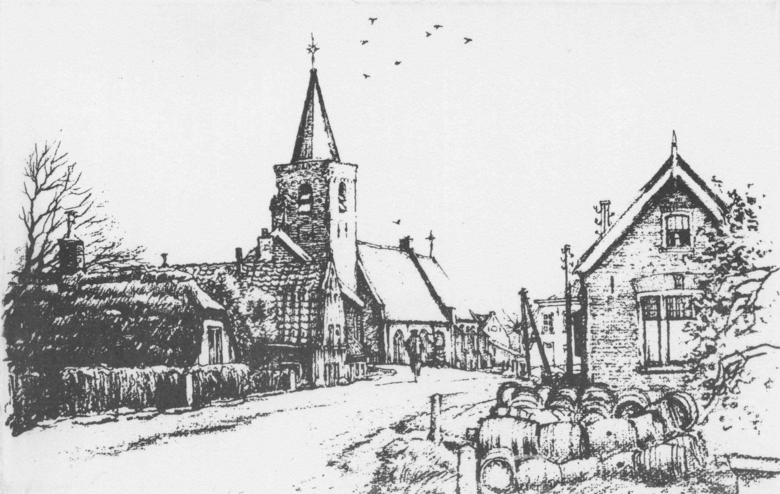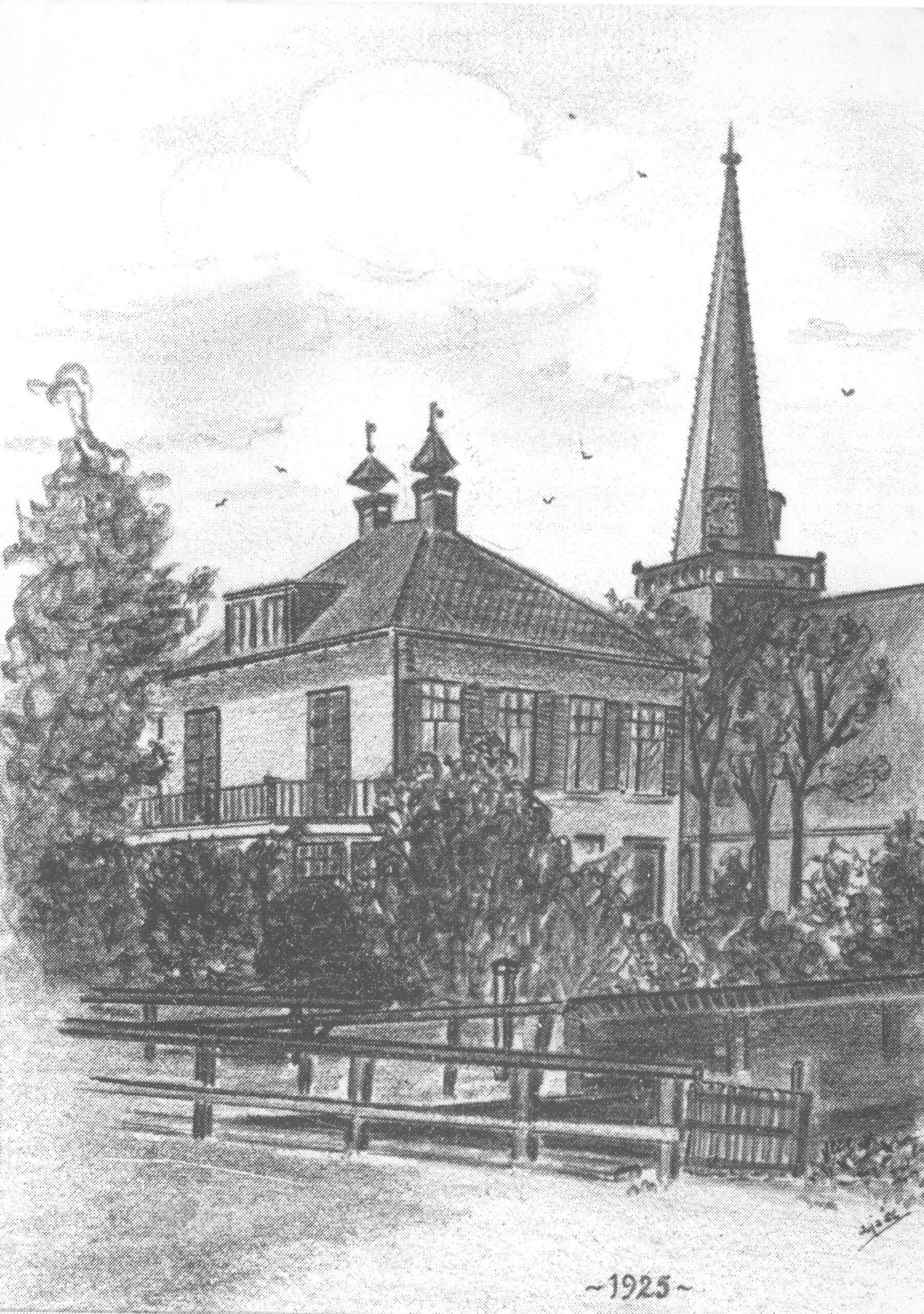 Een tekening van de pastorie van de Nederlands Hervormde Kerk. Deze tekening is gemaakt door Anja van der Grijn-de Groot.