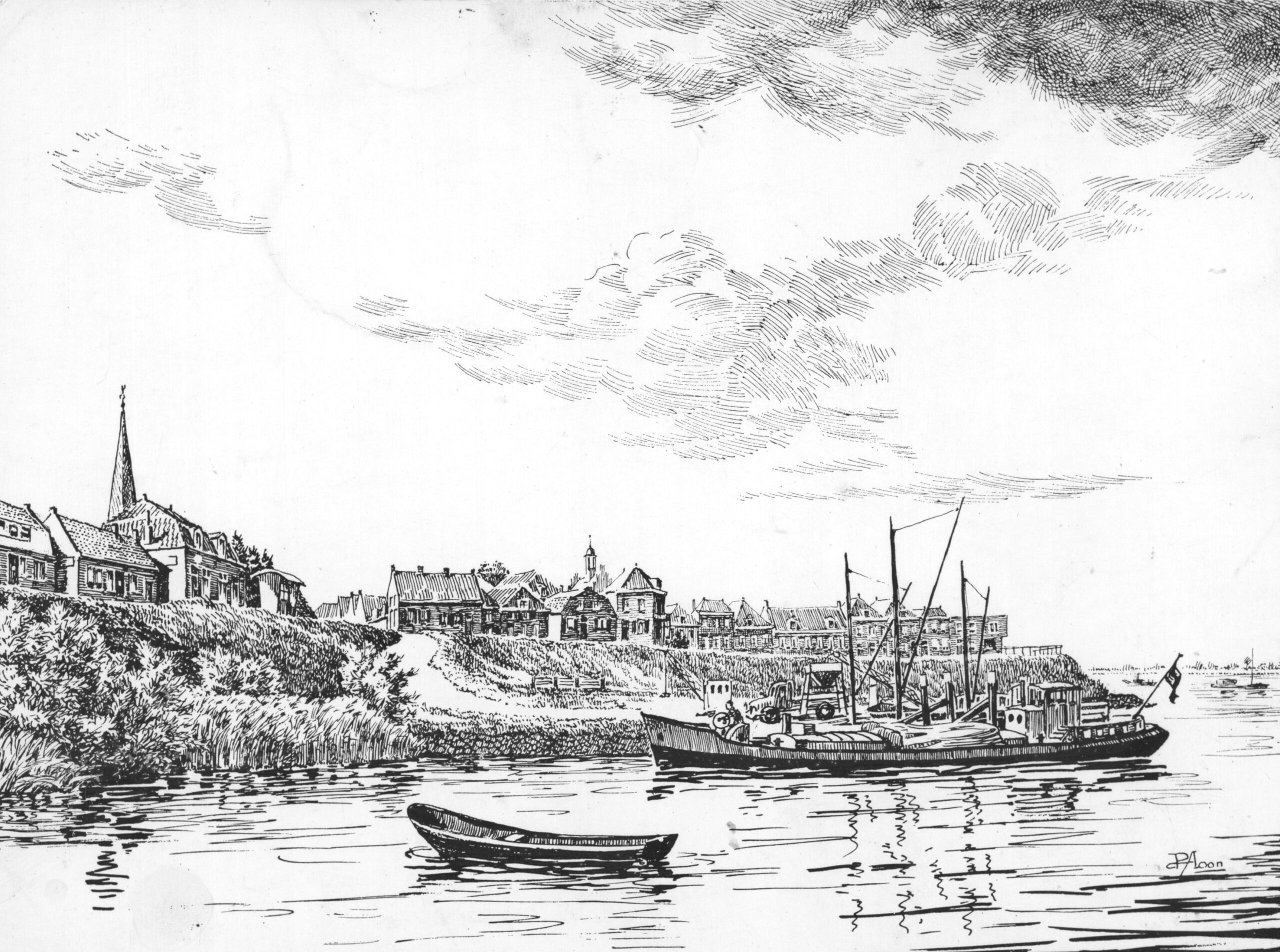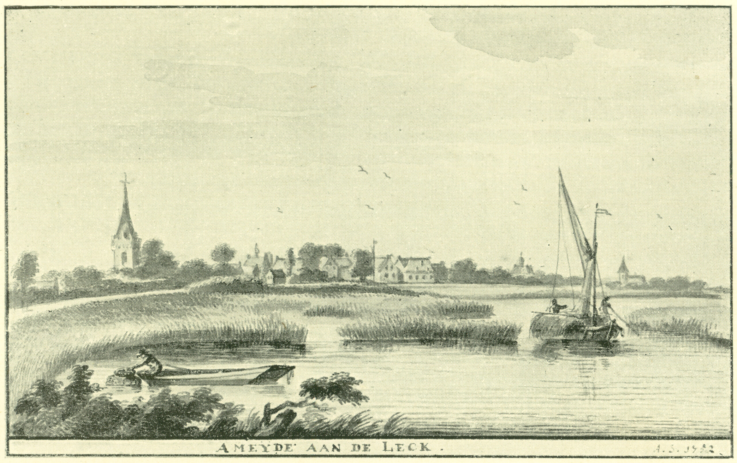Ameide, met het huis Herlaer en de kerk van Tienhoven in het verschiet. Naar eene teekening door A. Schouman, gesigneerd A.S., met het jaartal 1752 (op 18 Juni 1941 geveild bij van [...]