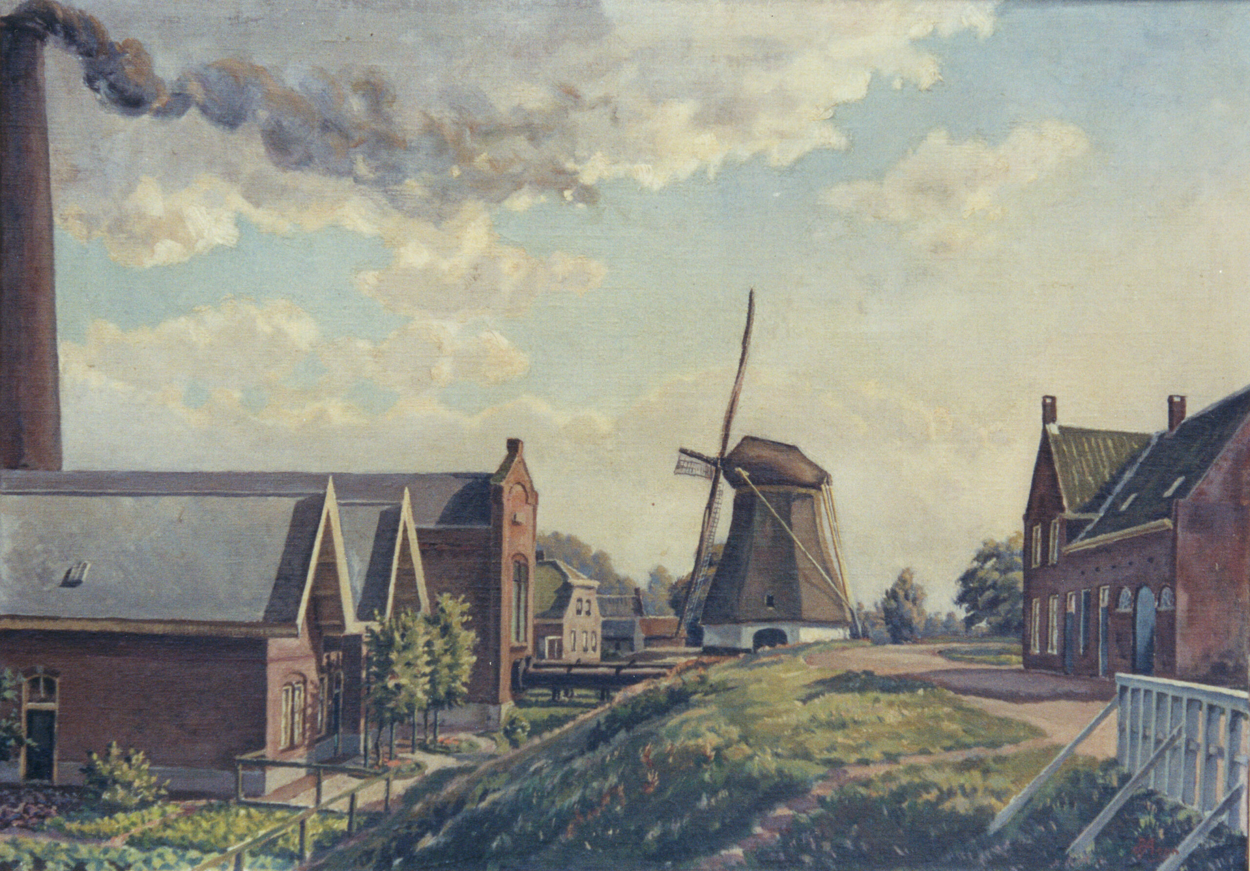 Een schilderij van P.A. de Hoon van Sluis met het gemaal en de molen nog in volle glorie.
