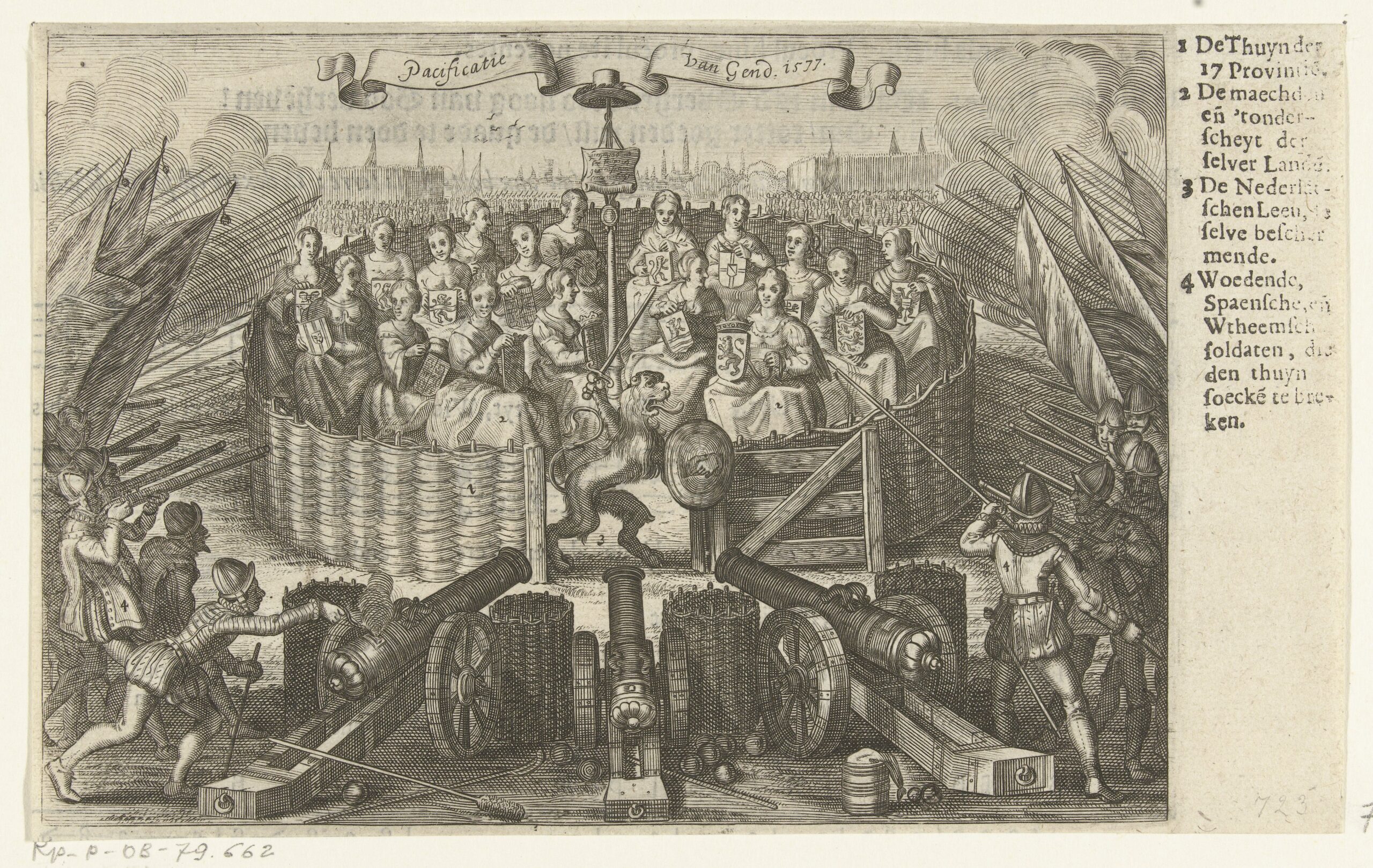 Bij de afbeelding: Allegorie op de Pacificatie van Gent, 1576. De Nederlandse Leeuw bewaakt de toegangshek naar de Hollandse Tuin waarin de personificaties van de zeventien provincies zitten. Spaanse soldaten met geweren en kanonnen hebben de tuin omsingeld. Rechts de legenda 1-4, op de achterzijde bedrukt met muziek. Bron: Rijksmuseum.