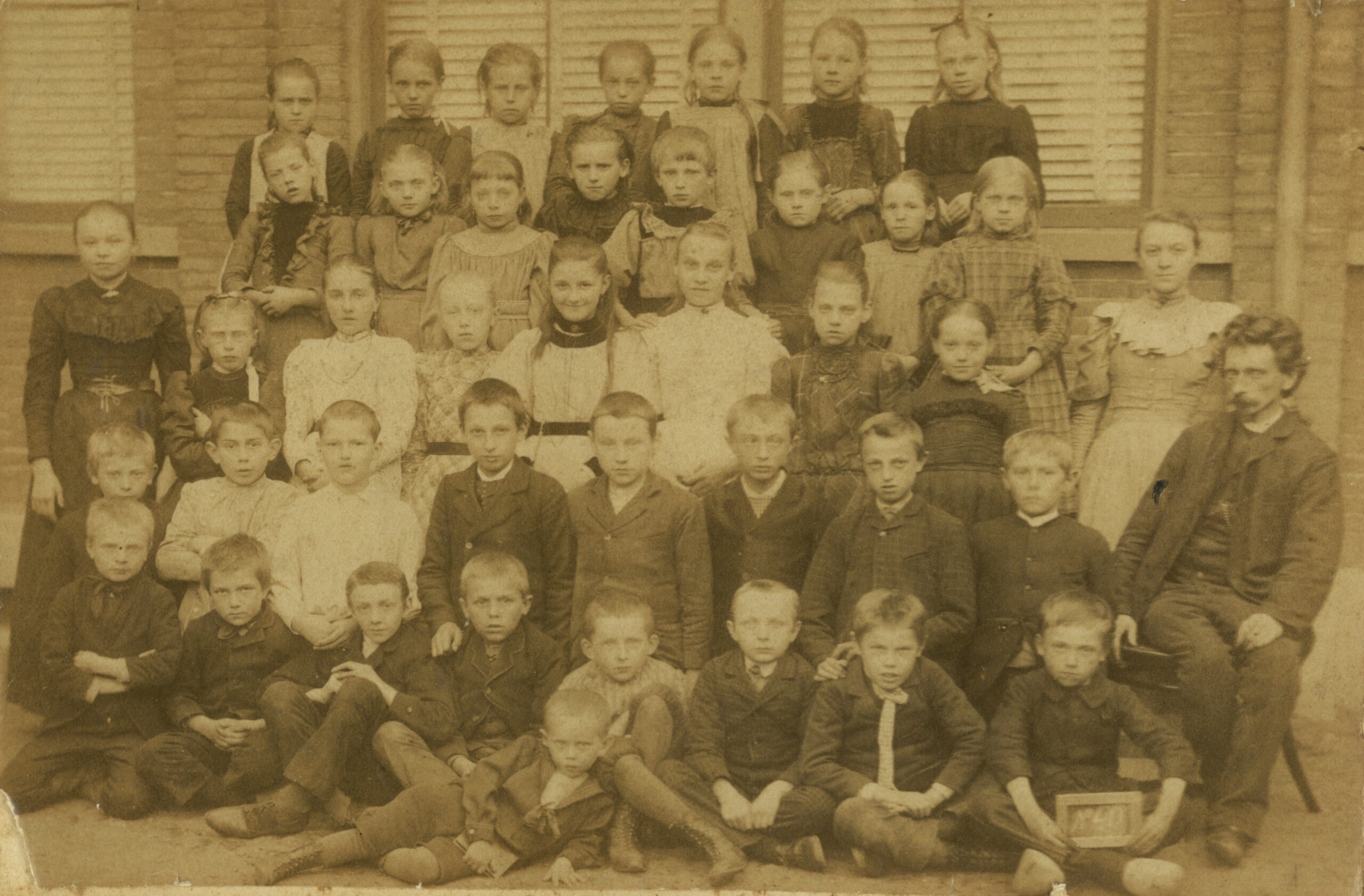 Een schoolfoto van de Openbare School van Ameide van rond 1900. Rechts op de foto staat Willem George Degenhardt hoofd van de openbare school van Ameide (1883-1911).