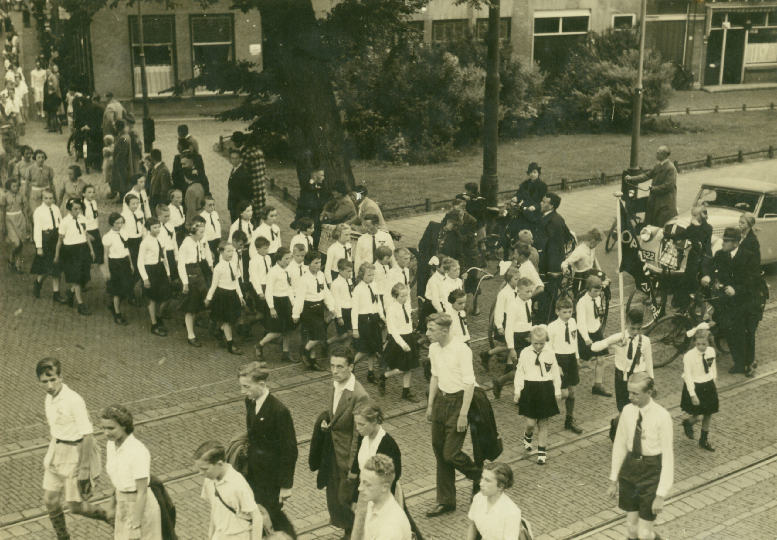 Wandelsport Vereniging “Op Mars”. Een mooie foto van de wandelsportvereniging “Op Mars”. Deze foto moet gemaakt zijn in een wat grotere plaats, want er liggen tramrails in de straat.