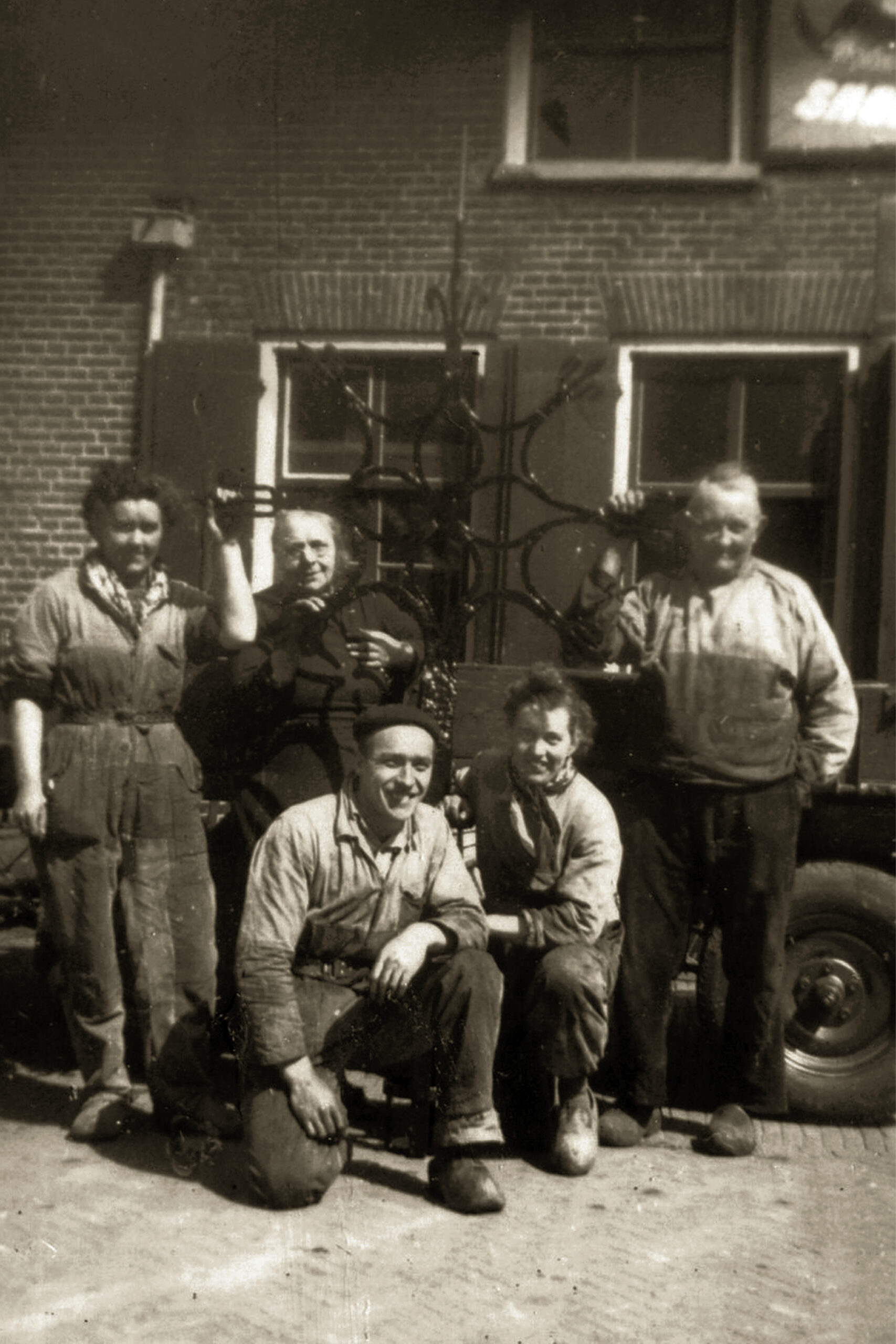 Smederij en ijzerwinkel Bart van Woezik, Dam 2 te Ameide. Op de foto, gemaakt in 1954, poseren voor het gesmede kruis, bestemd voor de Hervormde kerk van Ameide, vlnr.: Marie van Woezik [...]