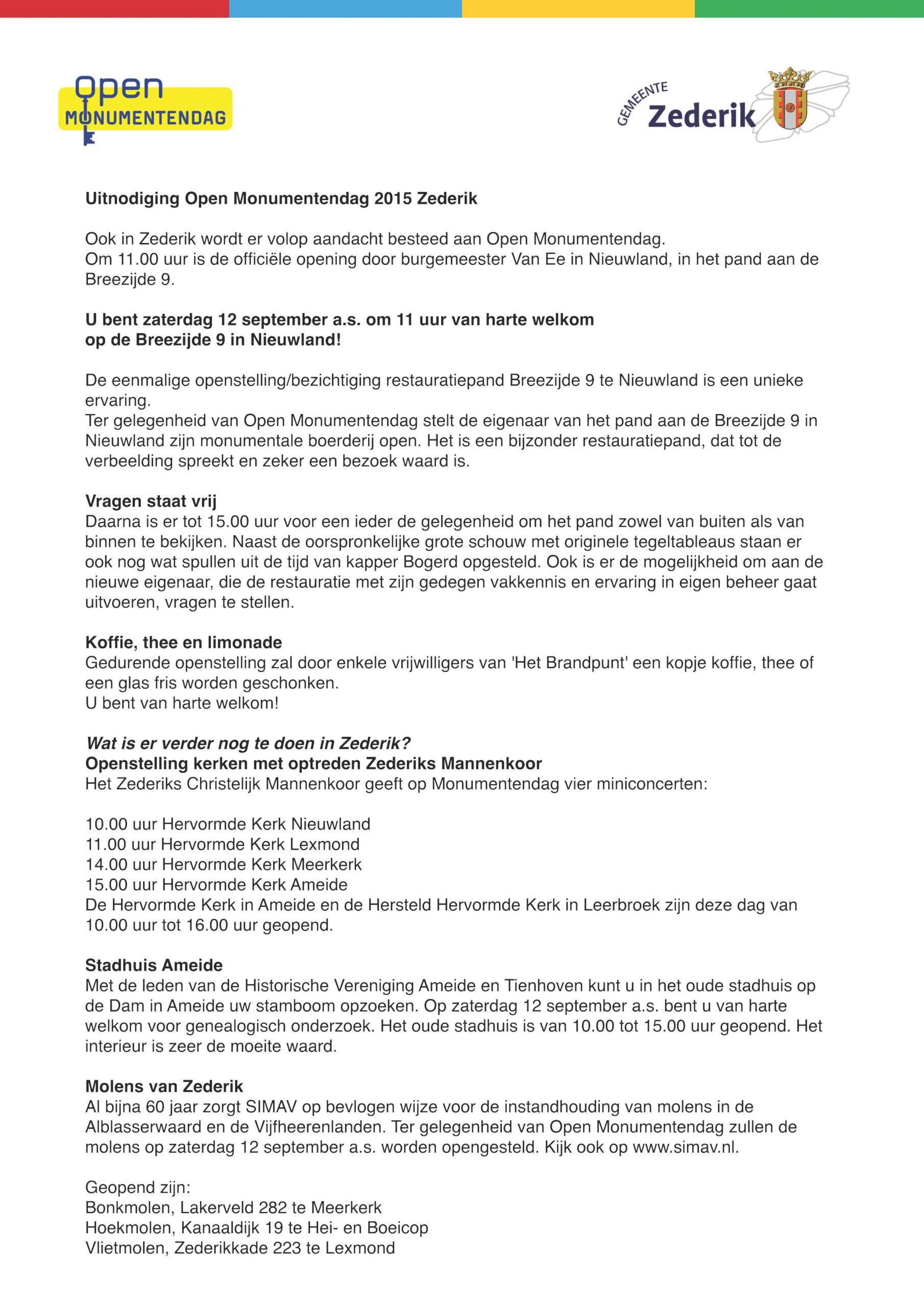 Uitnodiging Open Monumentendag 2015 Zederik Ook in Zederik wordt er volop aandacht besteed aan Open Monumentendag. Om 11 .00 uur is de officiële opening door burgemeester Van Ee in Nieuwland, in het [...]