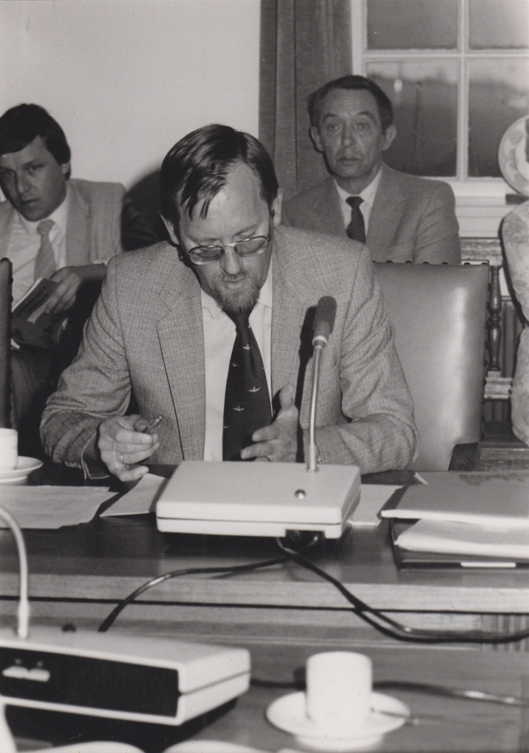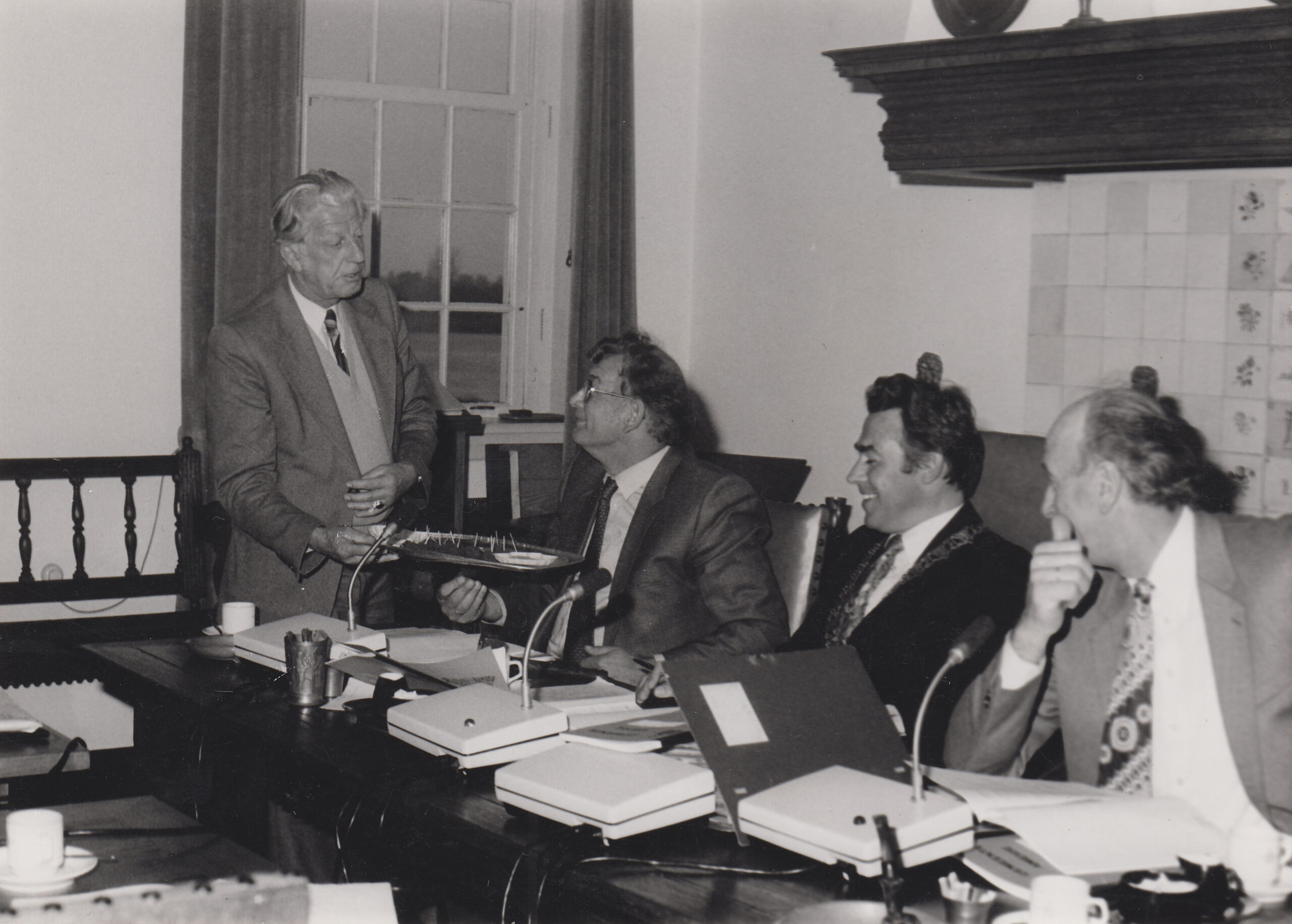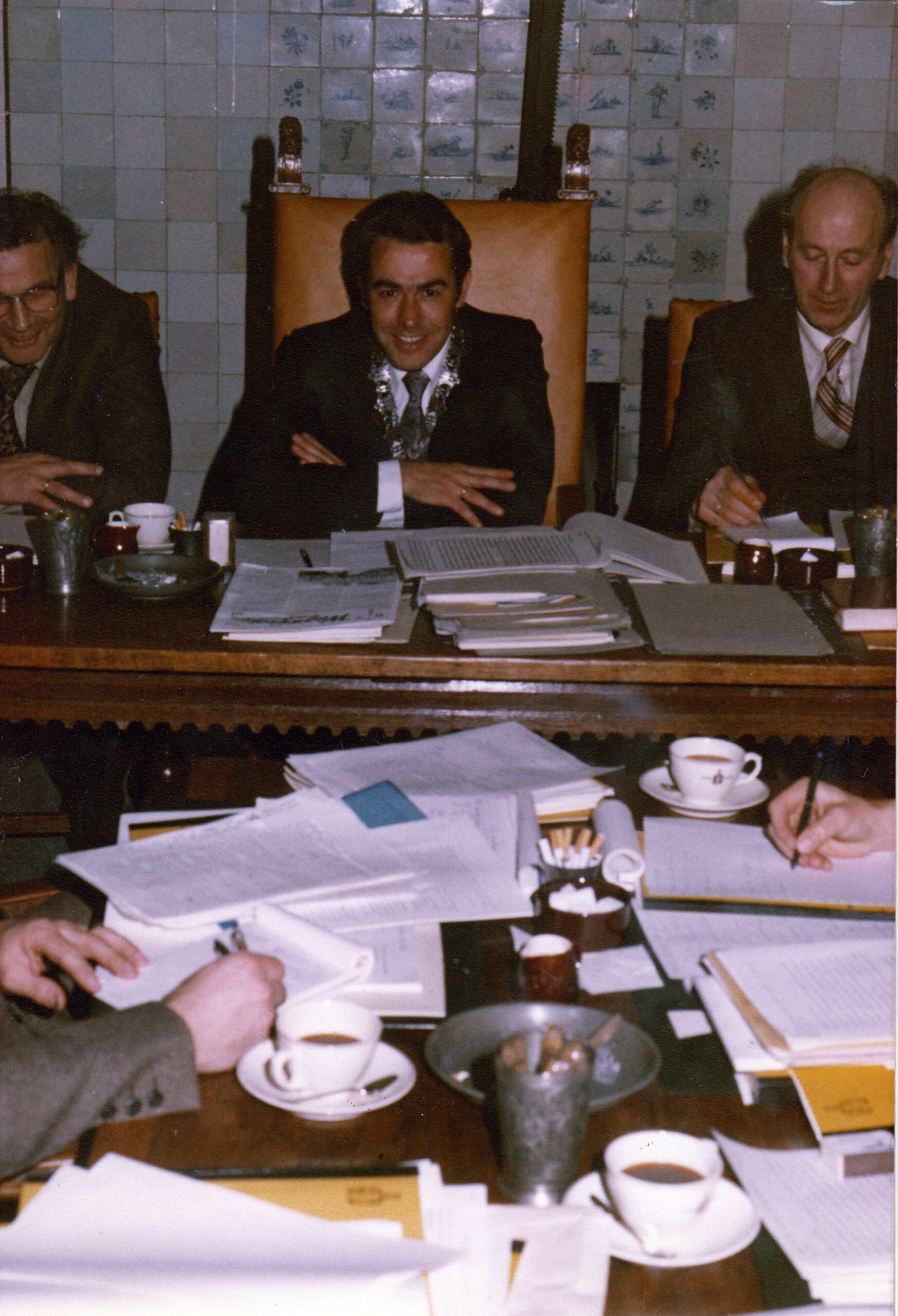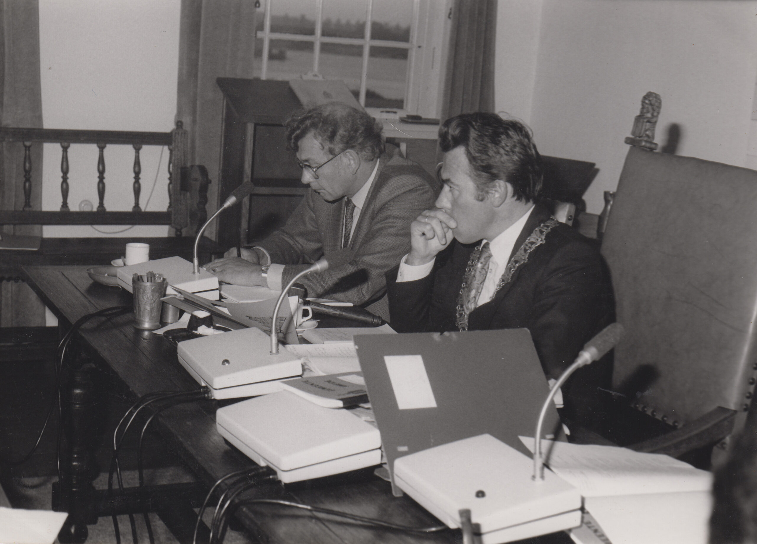 Tijdens den raadsvergadering (zo rond 1981) luistert burgemeester Cees Bakker aandachtig naar een betoog van een raadslid. Wethouder Arie Gerrit de Kruijk maakt aantekeningen.