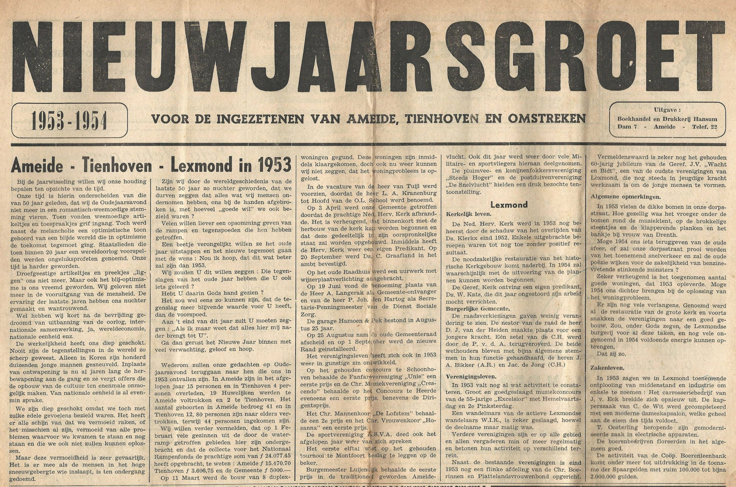Nieuwjaarsgroet 1953-1954 De Nieuwjaargroet is een uitgave van Boekhandel en Drukkerij Hansum – Dam 7 – Ameide – Telef. 22 De Nieuwjaarsgroet bevat naast een redactioneel artikel zeer veel advertenties van verenigingen, [...]